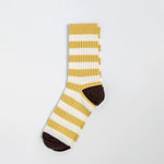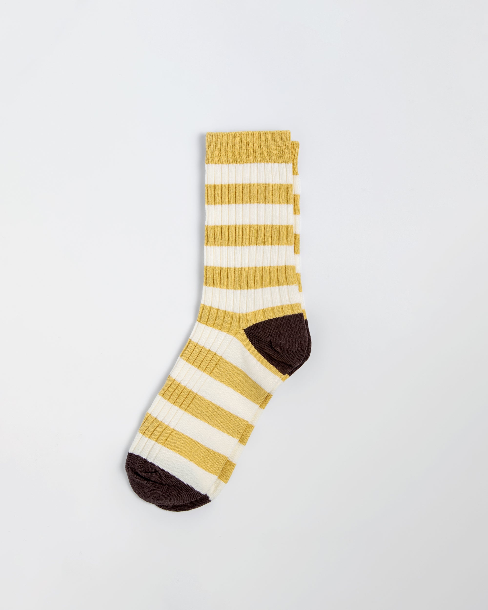 The perfect blend of bold and timeless, these stripe socks add a playful yet refined touch to any outfit. With their rich golden hue and contrasting accents, they bring comfort and style together effortlessly.