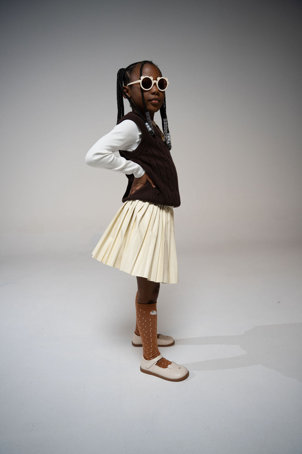 Girl in side profile pose wearing Little Miss Beary Glasses, styled with cream pleated skirt and brown vest