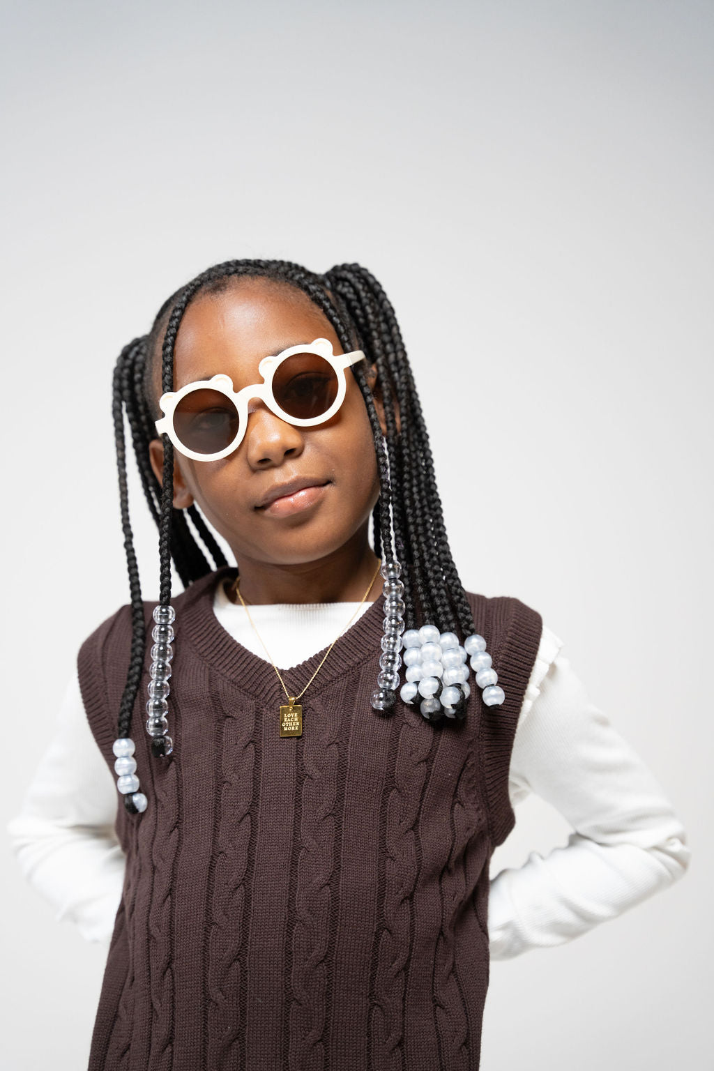 Close-up of a girl wearing Little Miss Beary Glasses with braids, brown vest, and gold layered necklaces